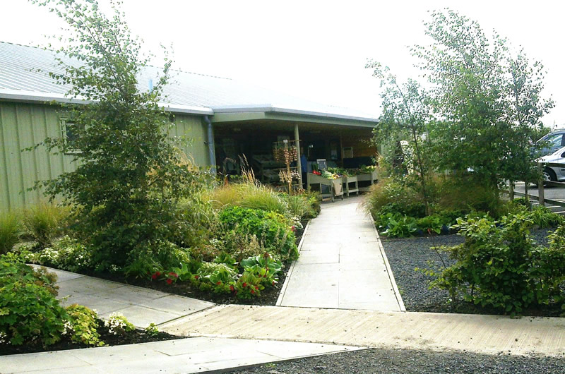 We were invited to produce planting designs for the area surrounding a newly constructed farm shop outside Edinburgh. A naturalistic planting scheme, combining grasses and meadow plants with native shrubs and trees, was used around the shop to soften the angular feel of the metal building and to root the farm shop in the surrounding rural landscape.