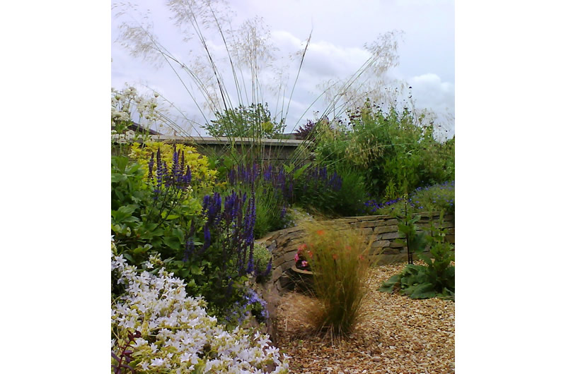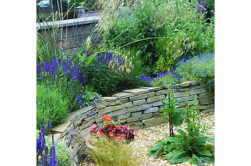We were engaged to brighten the front of the house and to introduce a softer, warmer and more inviting entrance to a garden that had become tired and unwelcoming. We designed split slate retaining walls to create borders that flowed sinuously around the front garden, and used golden coloured gravel to lift the colour of the slate and to blend with the colour of the house walls. The borders were planted up with a natural composition of grasses, warm coloured perennials and strongly fragrant plants that allowed some privacy from the street beyond but created an inviting and welcoming passage to the front door.