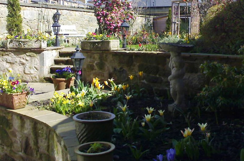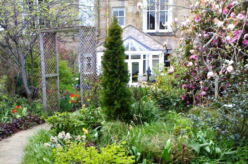 A Victorian townhouse within Edinburgh city comprising a narrow garden enclosed with high sandstone walls.