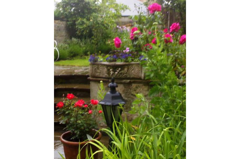 Two semi circular terraces with borders were designed, using random sandstone walling as retaining walls, immediately outside a newly built garden room. This allowed us to use the height difference in the garden to best effect and to bring nature right into a garden room. The terrace steps give access onto a circular lawn surrounded with roses and lavender that in turn leads to a path to the rear of the garden where a magnificent specimen magnolia acted as a focal point.