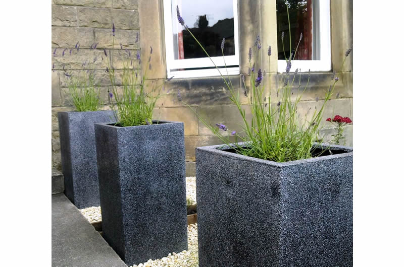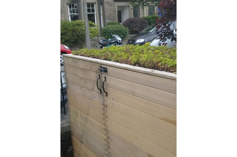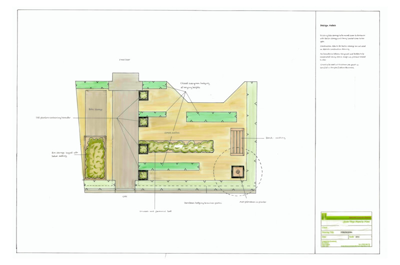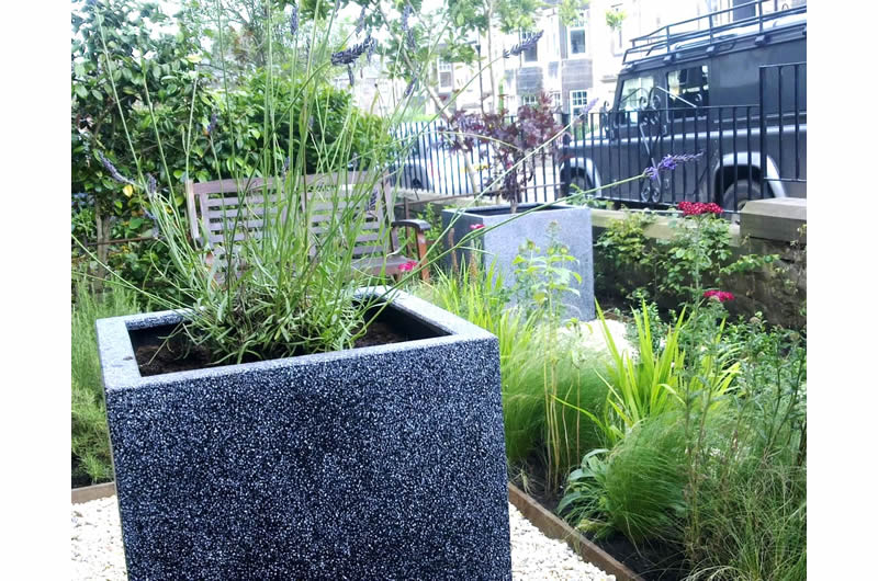 This front garden was made more inviting with the introduction of colour, fragrance and strong blocks of planting. Within a gravel seating area, blocks of formally trimmed box, rosemary and thyme were contrasted with the looser textures of a block of ornamental grasses and vivid coloured perennials. The path to the front door was lined with tall planters of lavender that raised their fragrance closer to the passer-by and a cedar storage unit, with a sedum roof was designed to conceal bins and recycling boxes.