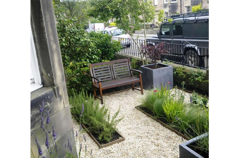 Small, south facing, front garden of a terraced house to the south of Edinburgh.